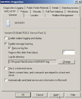 - Hacer clic en el check Enable Message Tracking y en Remove log files, escribir 7. Estas acciones habilitarán el Seguimiento de mensajes, para ello se crearán archivos .log y estos contendrán la información de entrada/salida de correos y serán eliminados cada 7 días. Nosotros podemos personalizar esta cantidad.